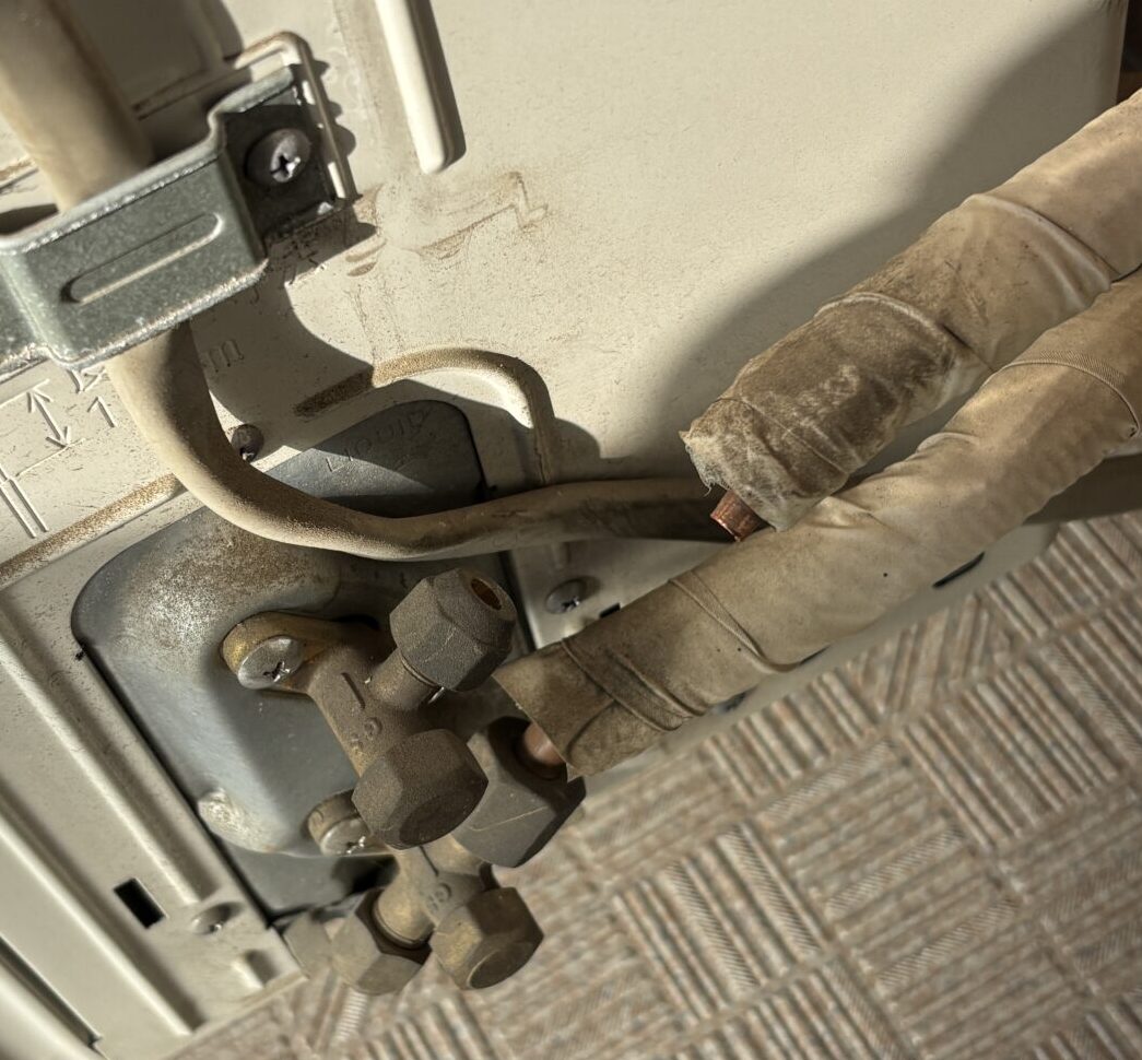 室内機と室外機を繋いでいる配管の接続口を見たところ、完全に2分配管がちぎれてしまっておりました。